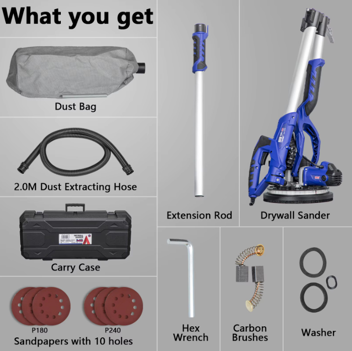 . Additional accessories: 1pc Hex Wrench, 1pc Dust Bag, 3pcs Vacuum House Connectors, 1set Carbon Brushes, 2pcs Different Gaskets, 3pcs Wool Rings, 1pc 8.2ft(2.5m) Dust Extracting Hose, 6pcs Sandpapers(215mm P180/240×3)